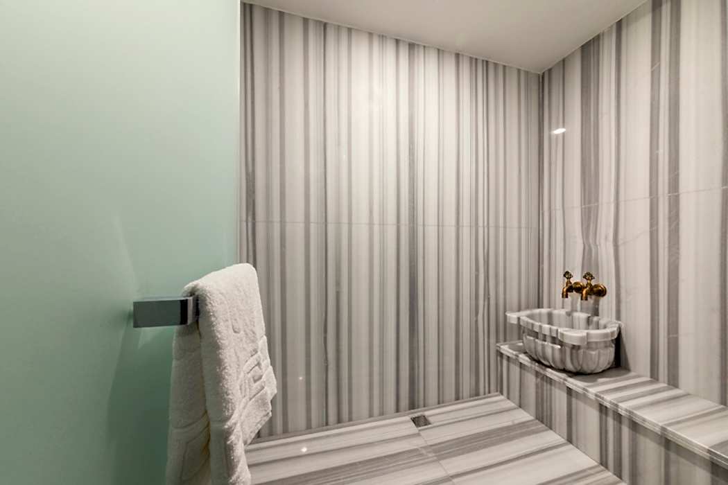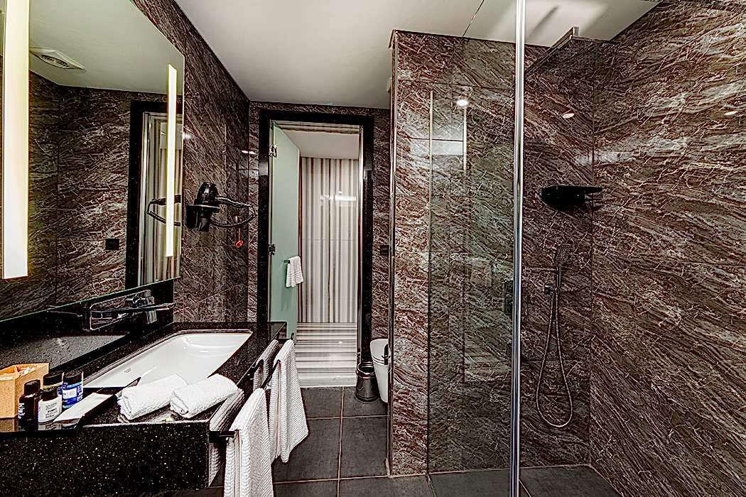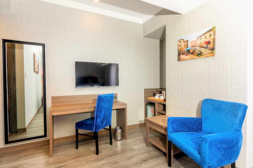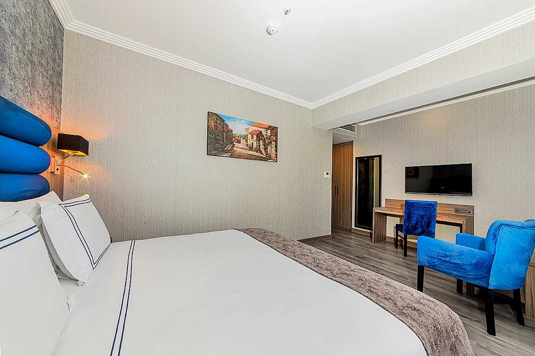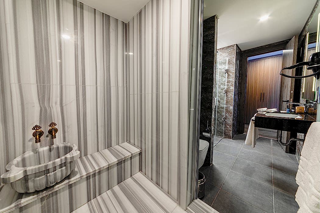 Experience luxury with city views in our Deluxe Double Rooms with Turkish Bath, spanning around 20 square meters. These rooms feature a King size bed, Smart LED TV, air conditioning, makeup table, safe box, water heater, welcome tray, telephone, and a mini-bar. The bathroom boasts a Turkish Bath section, a rain shower, a hairdryer, toiletries, and towels.