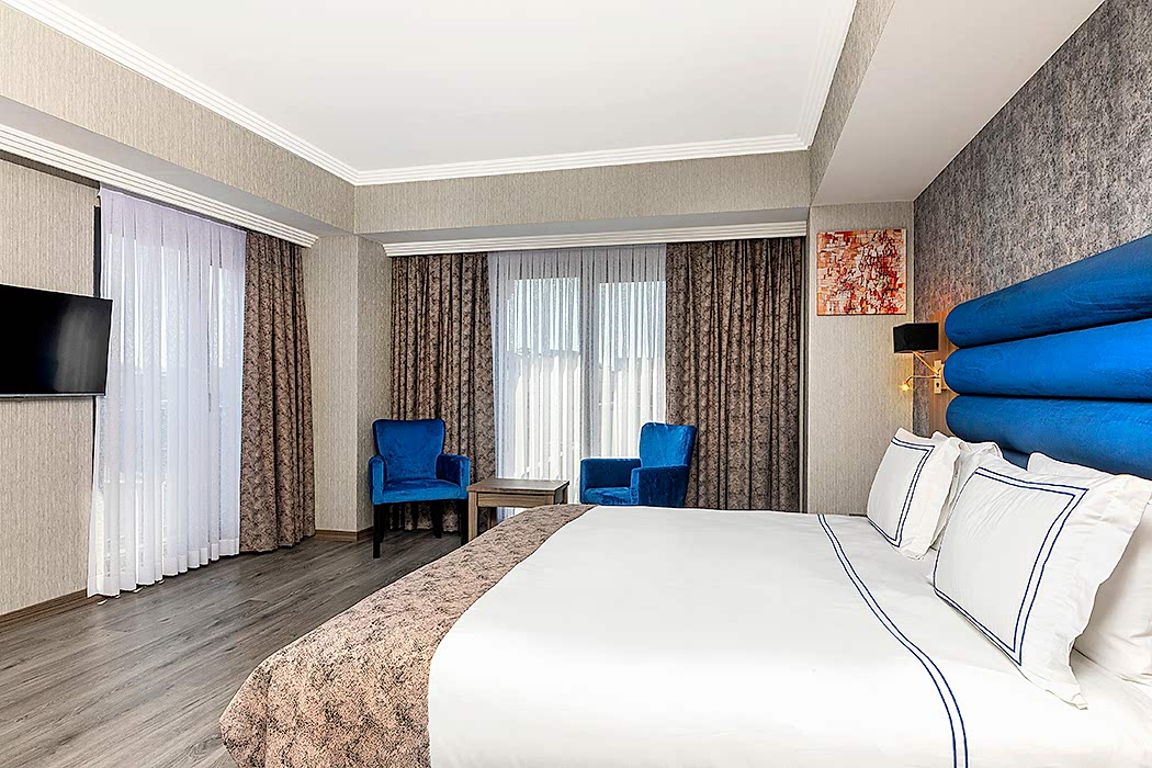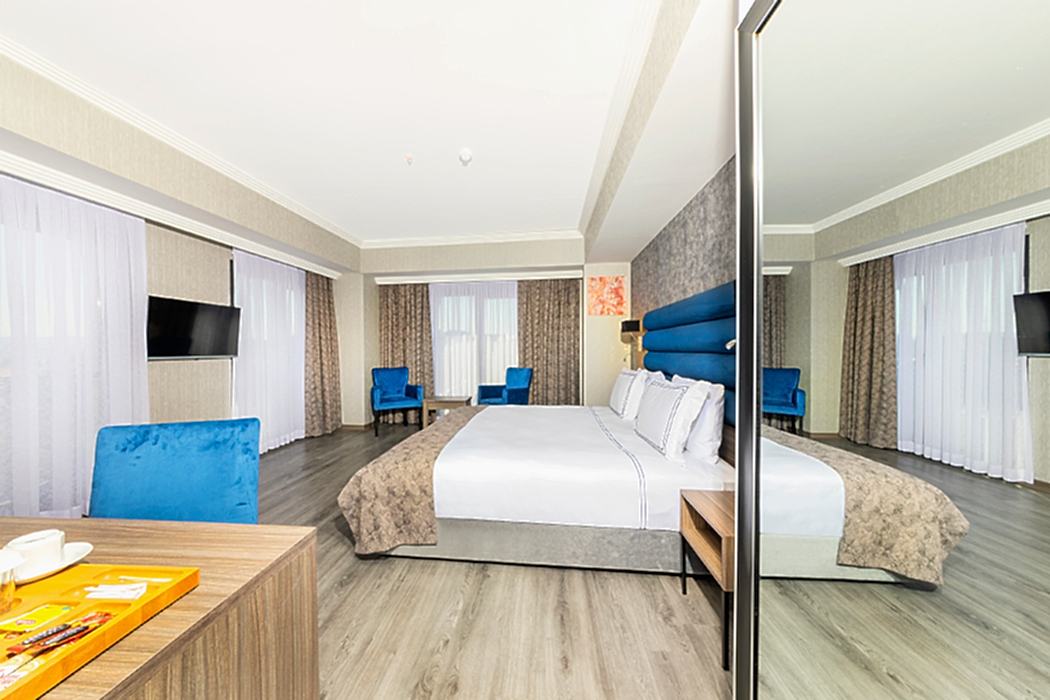 Indulge in panoramic views of the Bosphorus, Topkapı Palace, and Hagia Sophia from our Suite Room with Bosphorus View. These spacious rooms, around 30 square meters, feature a King size bed, Smart LED TV, air conditioning, makeup table, safe box, water heater, welcome tray, telephone, and a mini-bar. The luxurious bathroom includes a bathtub, a rain shower, a hairdryer, toiletries, and towels of various sizes.